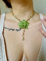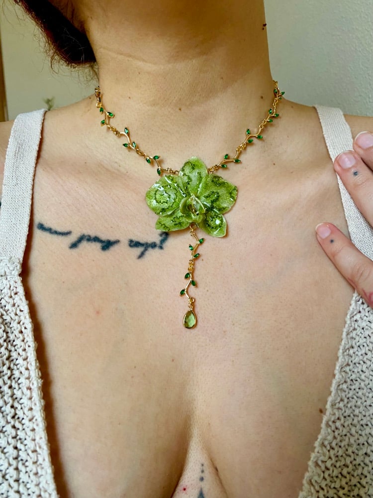 Mossy Triskel Orchid surrounded by gold plated green crystal leaf connectors and a Aventurine drop crystal